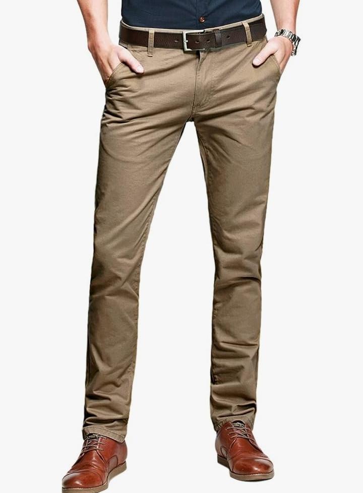 Our Dark Beige Soft Khaki Men's Trousers Features zipper fly and button closure, front slant pockets, fifth-coin pocket at waistband, and classic back welt pockets Fitted through hip and thigh, with tapered leg. Sits below the waist Straight leg: Straight through the seat and thigh with straight leg opening Classic style: Soft, high quality fabric, very comfortable to wear